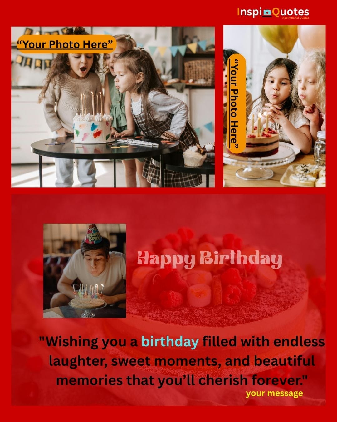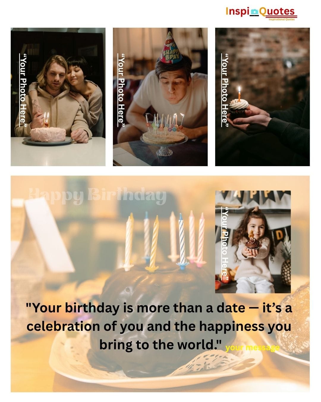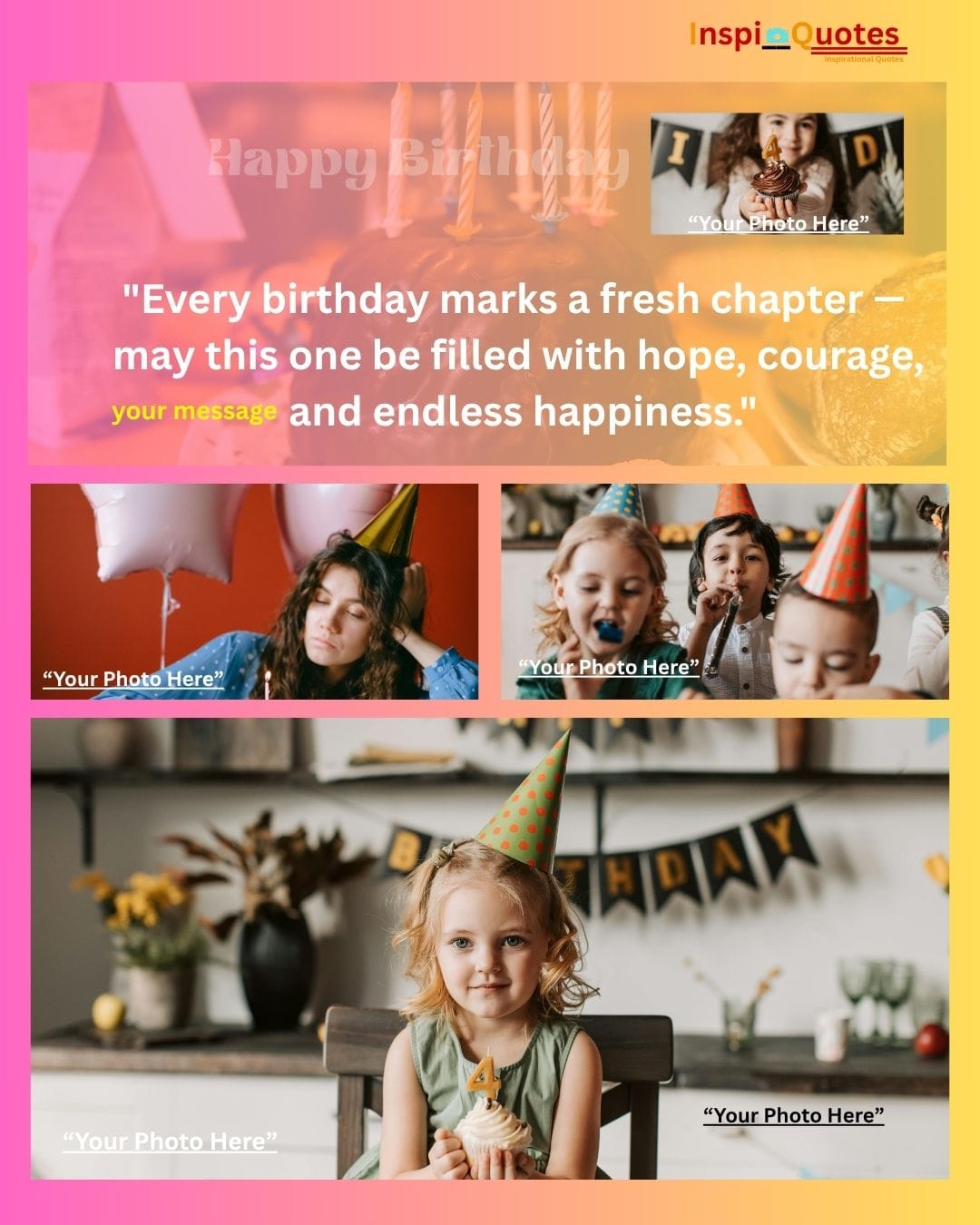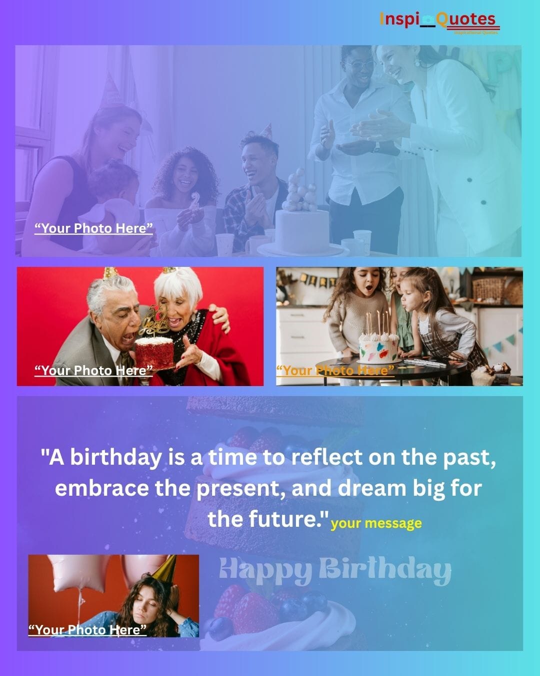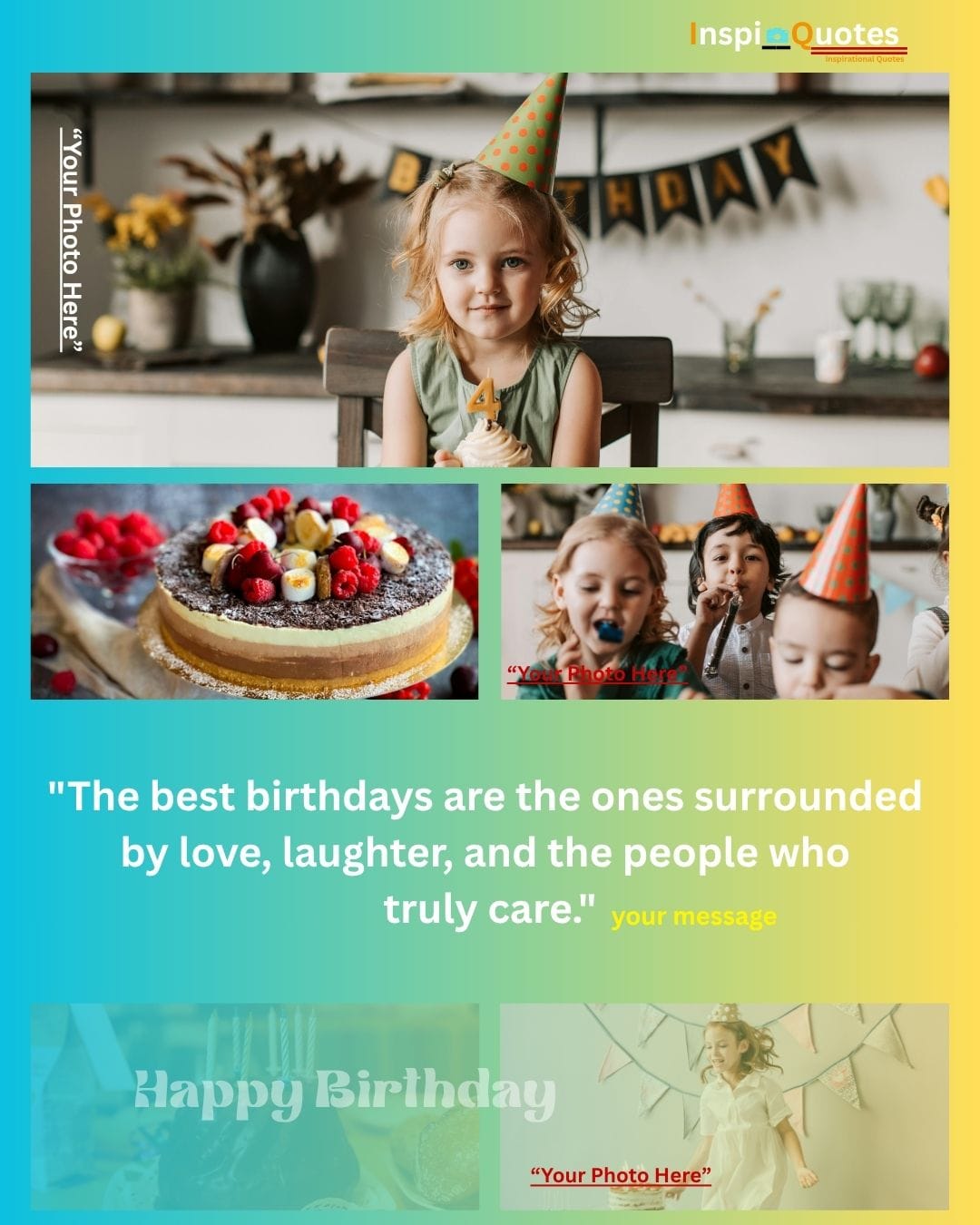 Design Insight: Shared Joy & Cohesion: Features a striking blue-to-yellow gradient backdrop to symbolize warmth and cheer. The collage is unified by the theme of multi-person celebration (children, cake), emphasizing the social and loving aspect of birthdays.