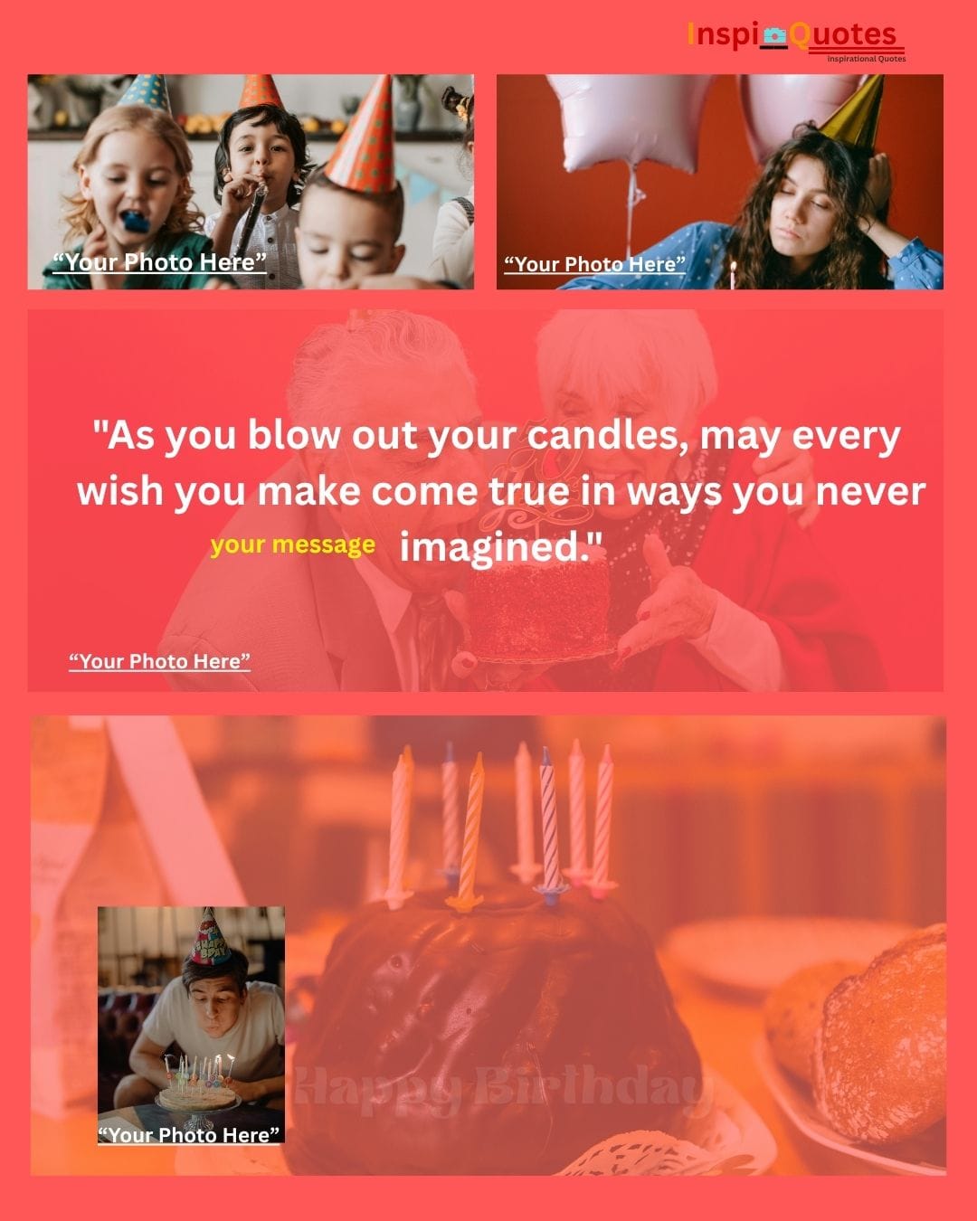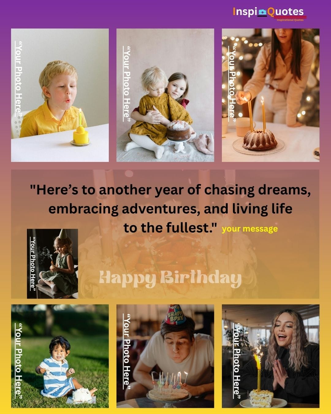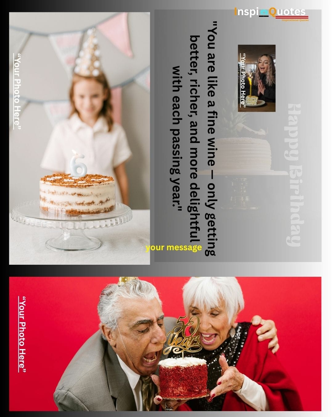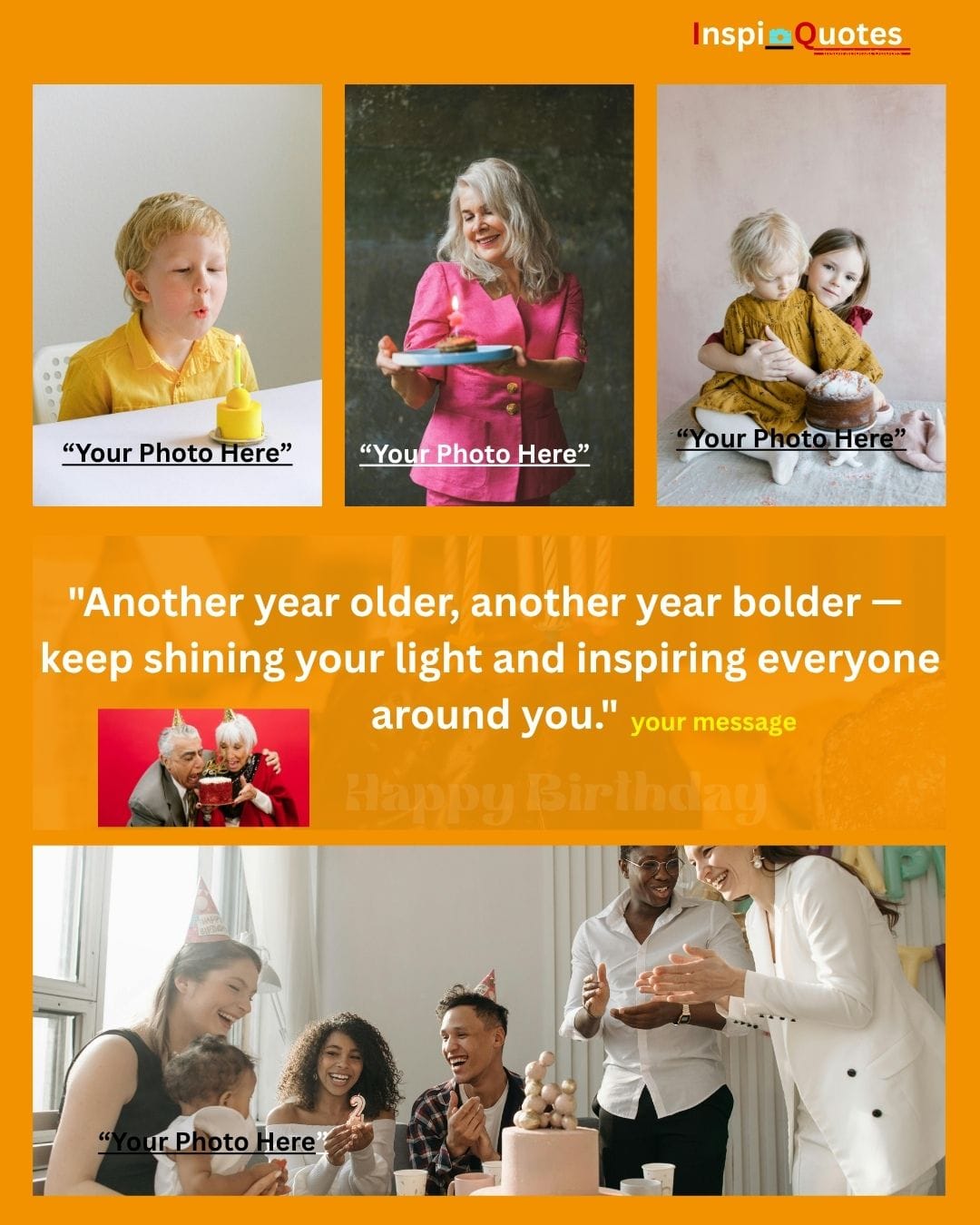 Design Insight: Adventure & Diversity: A complex multi-photo grid showcasing diverse ages and activities (outdoor play, celebrating with sparklers). The design is unified by a warm filter, emphasizing adventure and lifelong energy, ideal for a general, motivational wish.