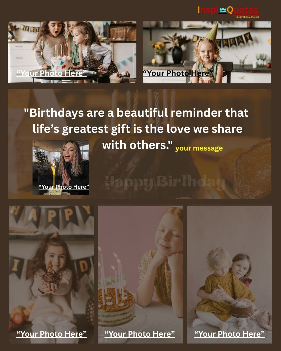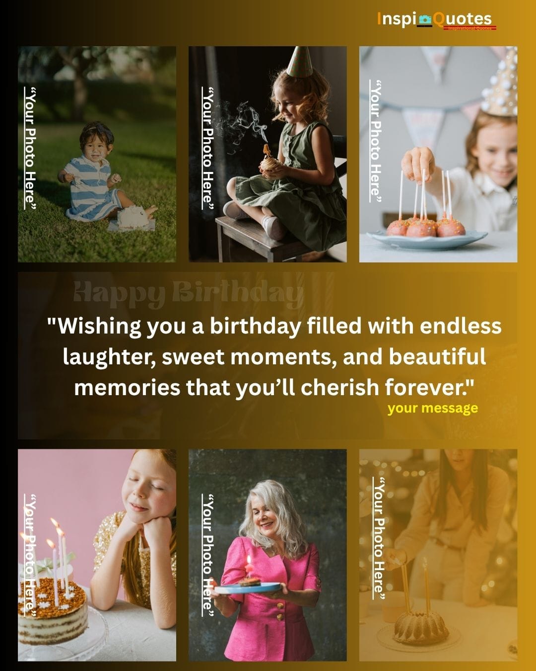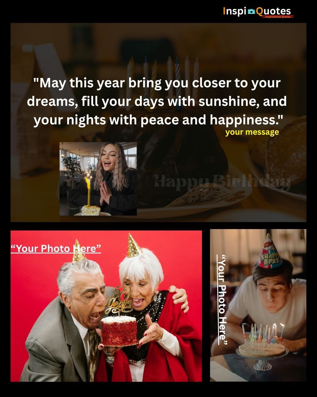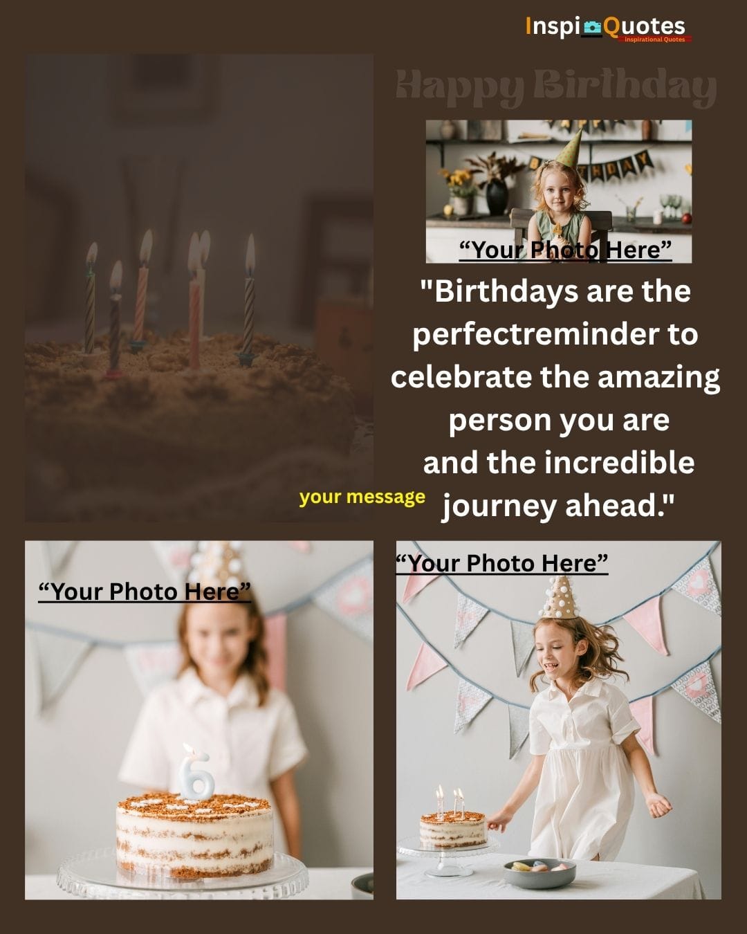Design Insight: Dreamy & Aspirational: Features a dark, rich chocolate cake background with intentional soft-focus lighting. The collage blends photos of different ages to convey a universal wish for personal growth and dream pursuit across a lifetime.