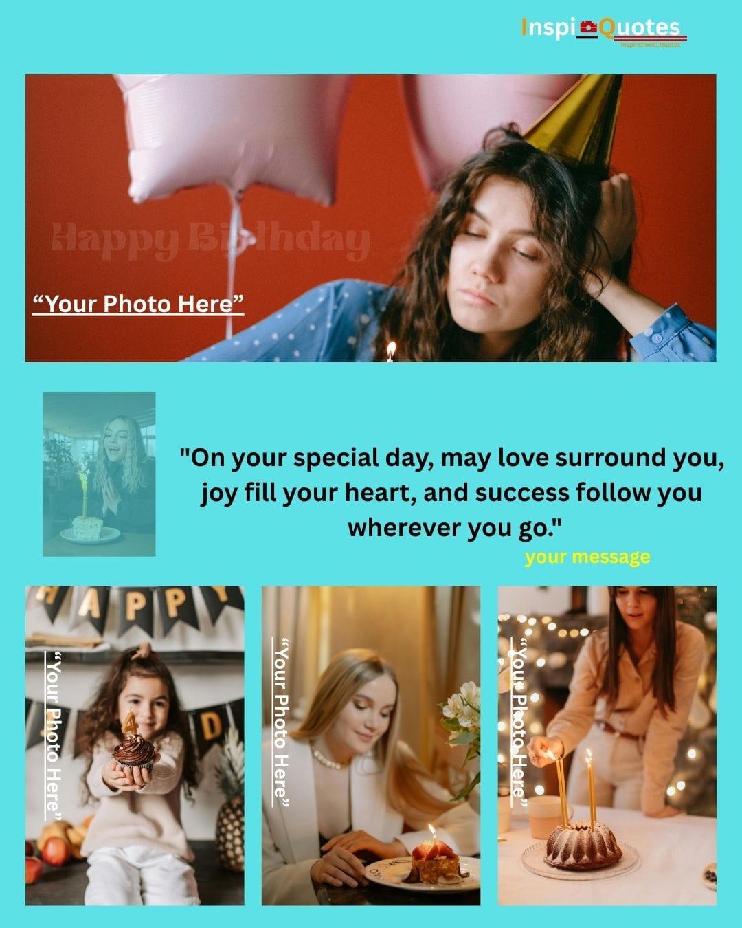 Design Insight: Modern & Aspirational: A visually dynamic design using a striking aqua and orange color scheme. The composition features modern portraits and symbolic items (balloons), conveying a cool, contemporary wish for success and happiness.