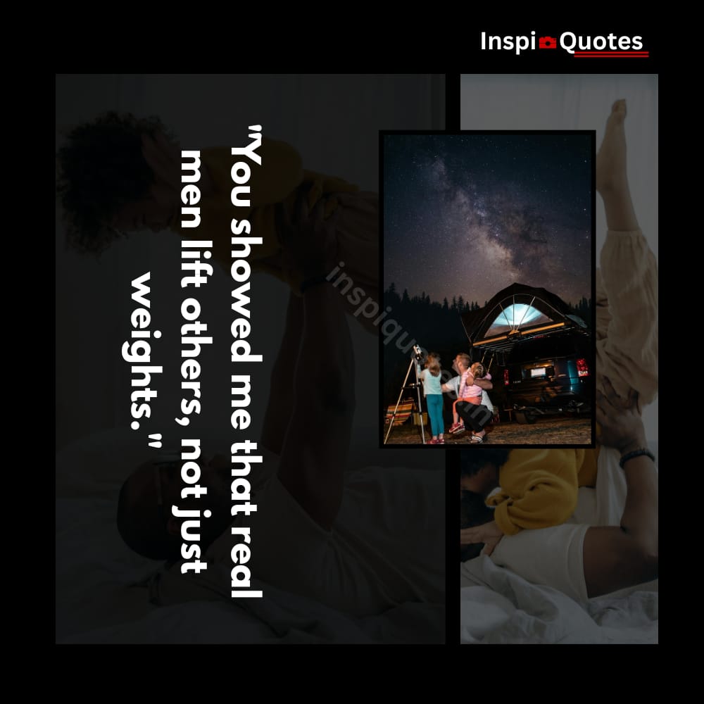 This campfire moment turns strength into service. The quote redefines masculinity — lifting others emotionally, not just physically. The playful lift and starry night reflect warmth, support, and quiet leadership.