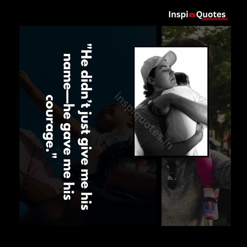 This grayscale tribute turns identity into inspiration. The quote honors the father who passed down more than a name — he passed down courage. The close embrace and monochrome palette reflect legacy, strength, and emotional depth.