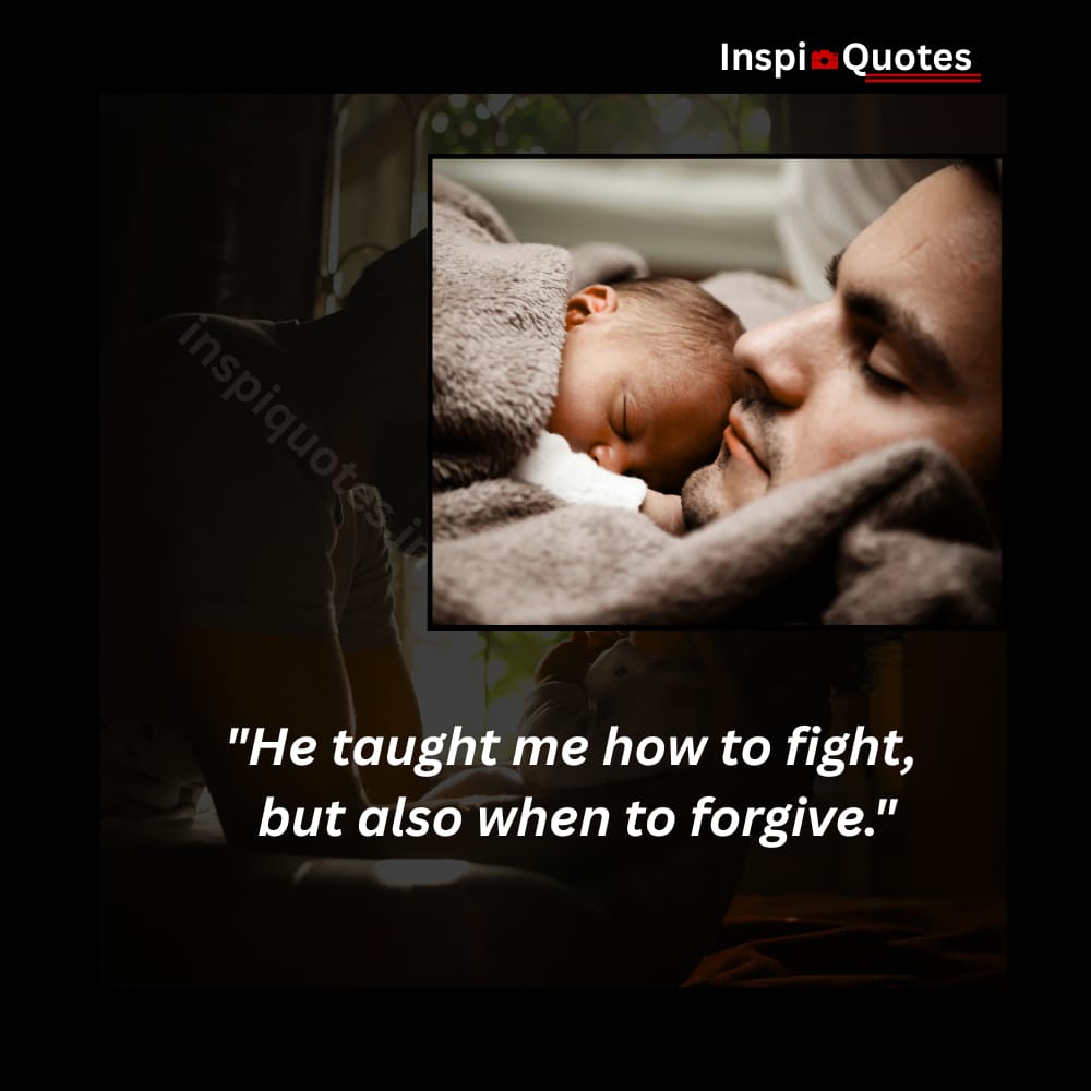 This contrast of shadow and warmth turns discipline into depth. The quote honors the father who teaches both strength and softness — how to stand firm and when to let go. The sleeping baby and silhouette reflect emotional duality and quiet power.
