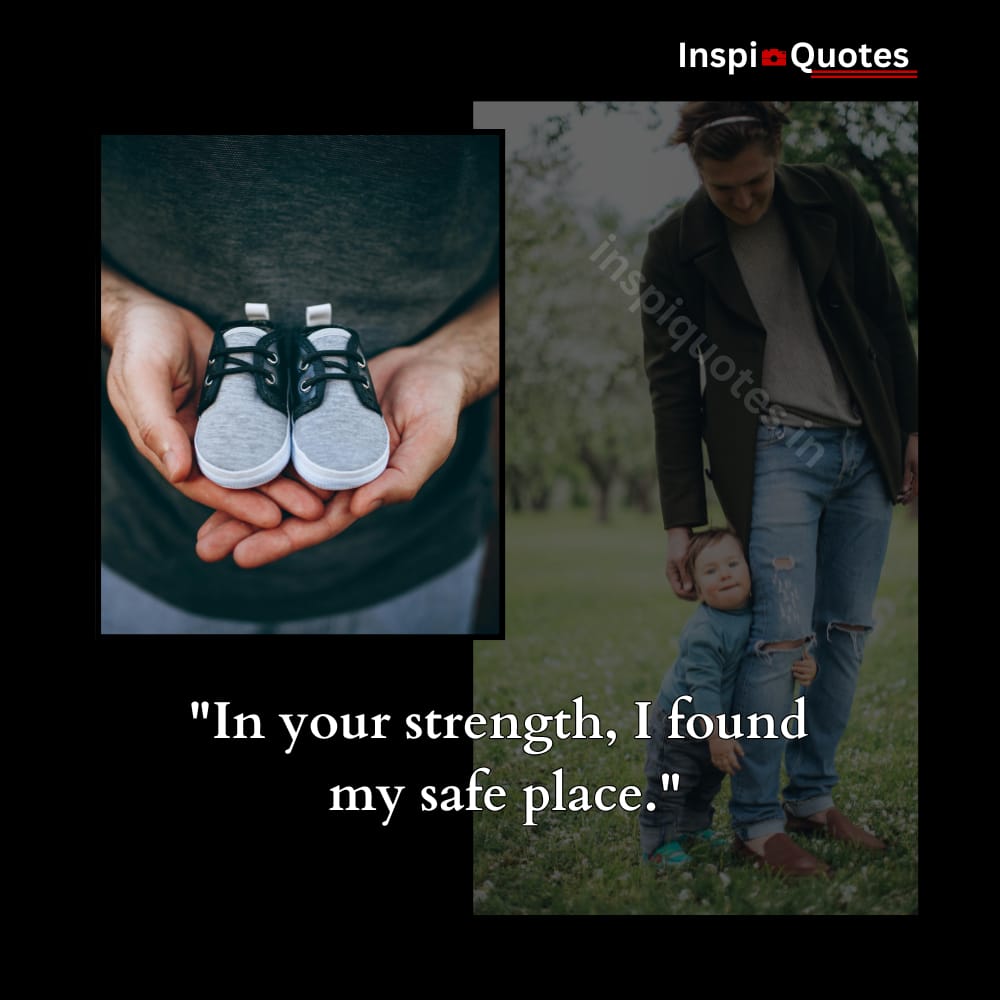 This outdoor hug turns strength into sanctuary. The quote honors the emotional safety a father provides — not just through protection, but through presence. The baby shoes and leg embrace reflect grounding, trust, and quiet devotion.