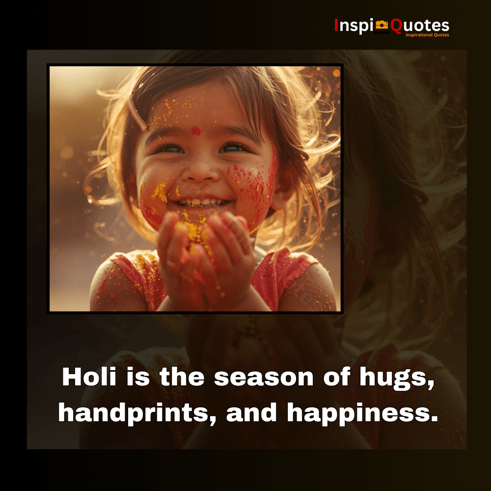This joyful child turns powder into poetry. The quote celebrates Holi as a festival of affection — where handprints become hugs and colors become memories. The clasped hands reflect innocence and warmth.