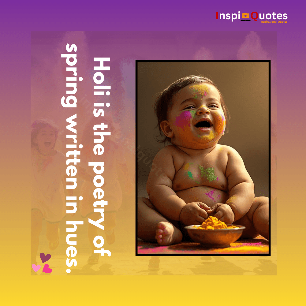 This crawling moment turns powder into peace. The quote reframes Holi as a palette — where every soul finds its shade of calm, joy, and belonging. The child’s motion reflects emotional curiosity.