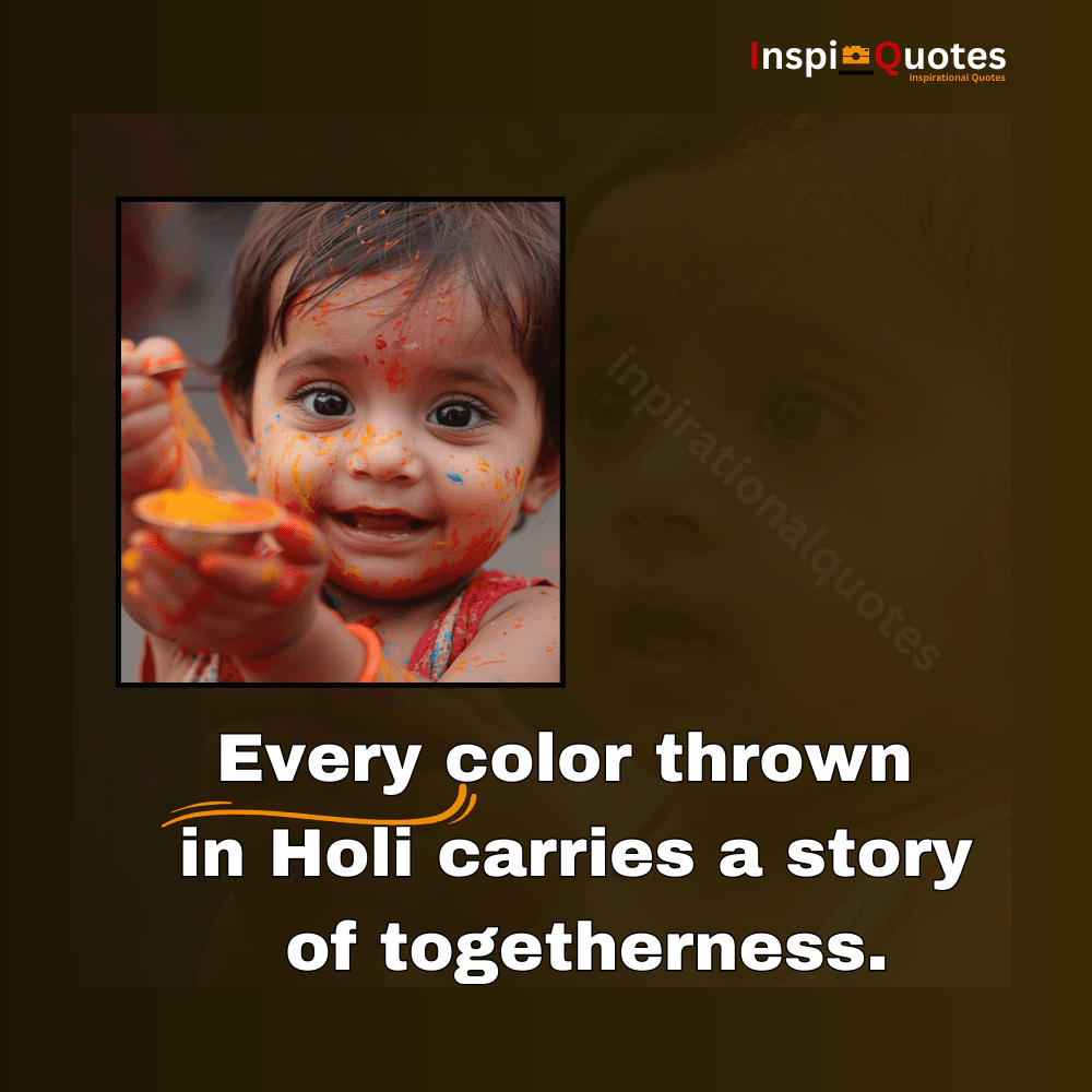 This sunlit moment turns sharing into brightness. The quote celebrates Holi as a reminder that joy multiplies when shared. The children’s smiles reflect emotional clarity and connection.