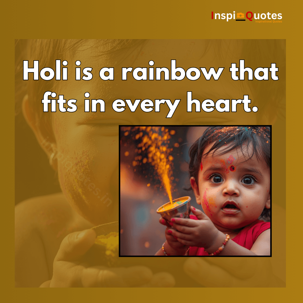 This layered portrait turns surprise into metaphor. The quote celebrates Holi as a rainbow that fits in every heart — a festival where joy becomes universal. The child’s expression reflects emotional wonder.