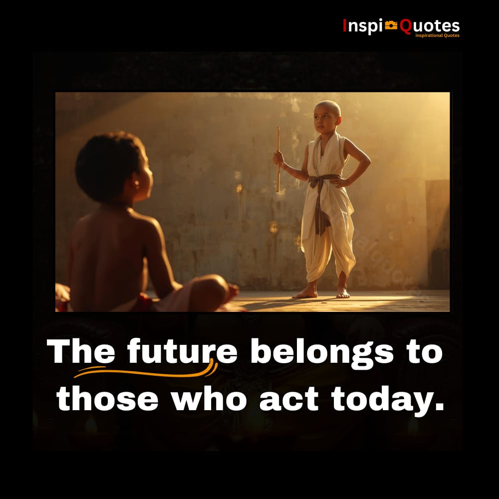 This quote calls for urgency. Use bold typography, directional lines, and a character in motion — perhaps mid-step or reaching forward. The background should suggest momentum: blurred edges, dynamic lighting, and a sense of forward thrust. Make the viewer feel the need to act.