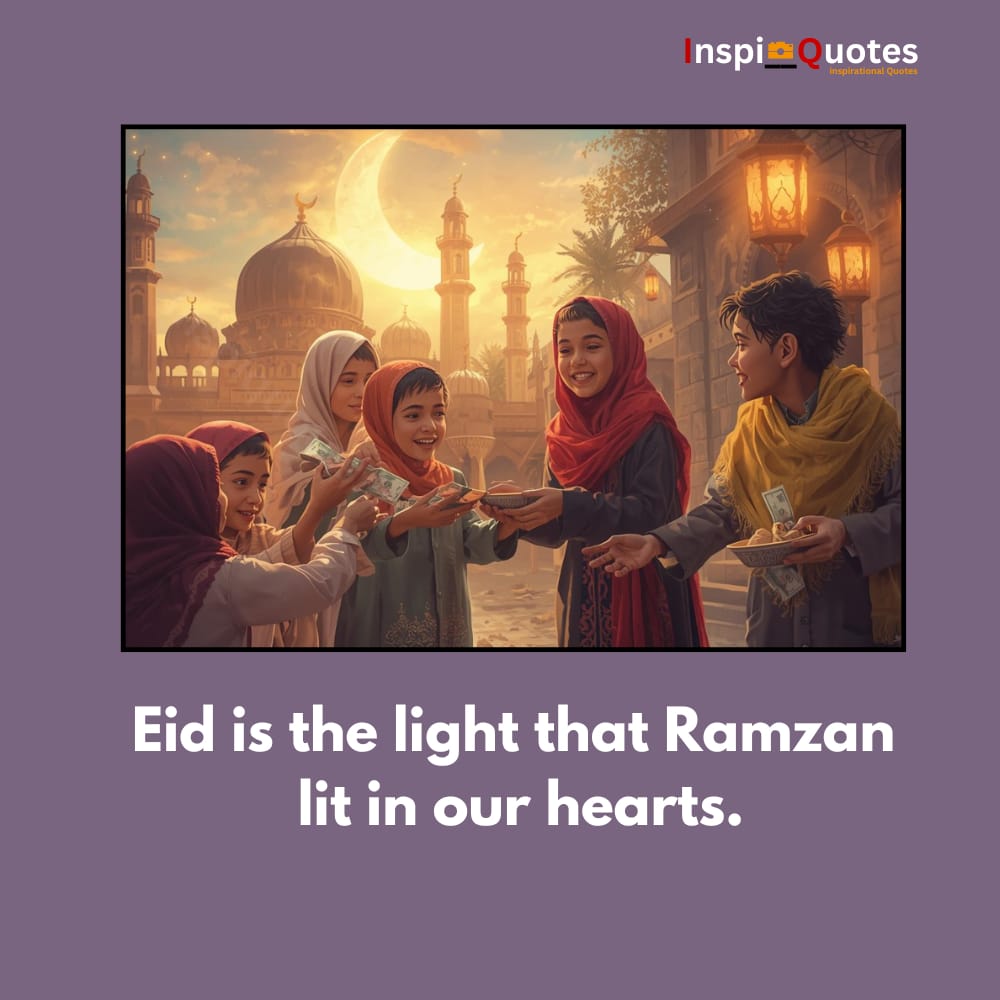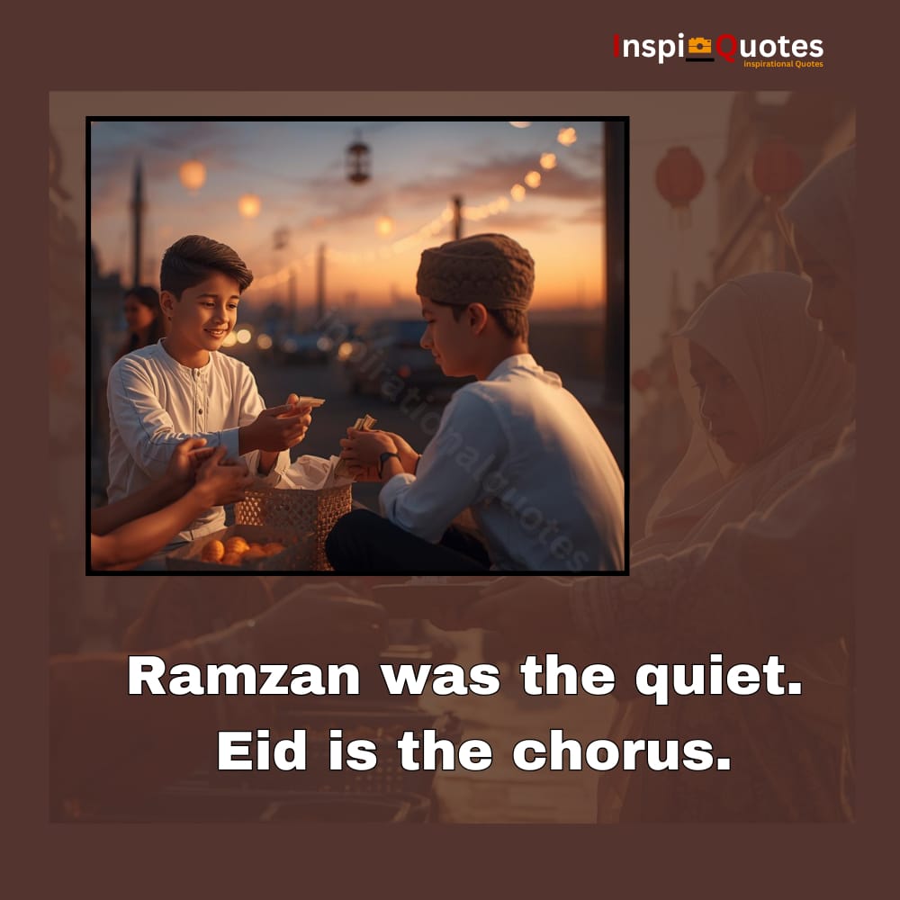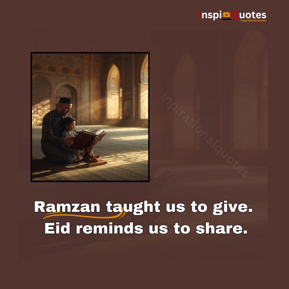 **Unique Commentary:** The image of giving reflects Ramzan’s quiet generosity, while the quote bridges this spiritual giving with the open, communal sharing of Eid—a clear reminder that faith begins in solitude but blossoms in connection.