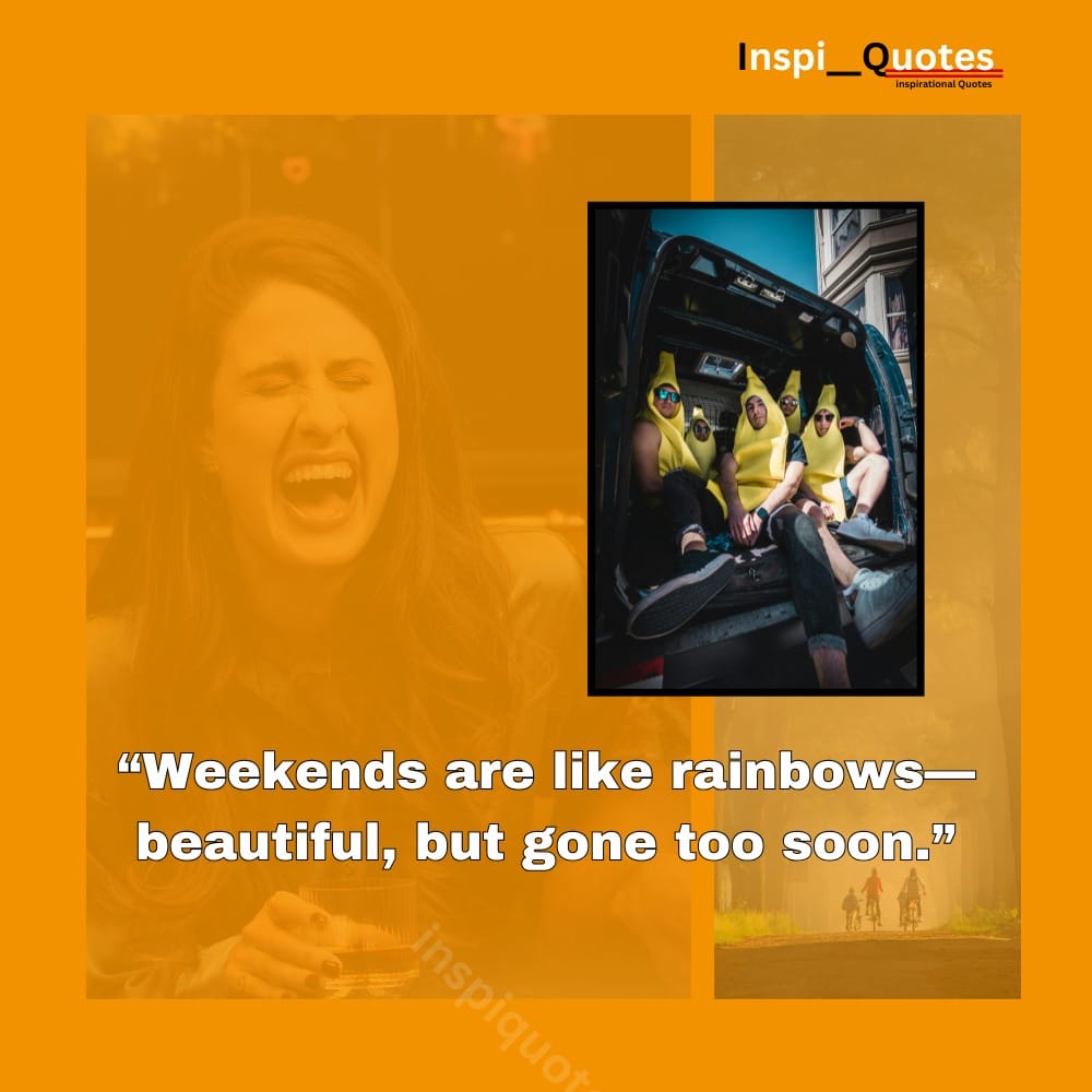 This banana-costume collage turns fleeting time into laughter. The quote compares weekends to rainbowsтАФbeautiful but brief. The joyful faces and playful outfits reflect emotional brightness and shared delight.