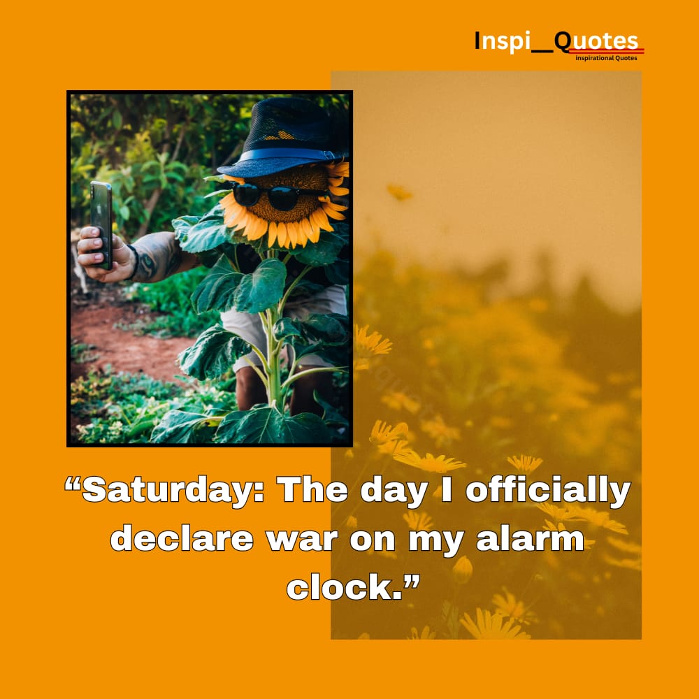 This sunflower selfie turns sleep into satire. The quote declares war on alarmsтАФSaturday as a sleep-in rebellion. The garden setting and costume reflect emotional humor and weekend freedom.