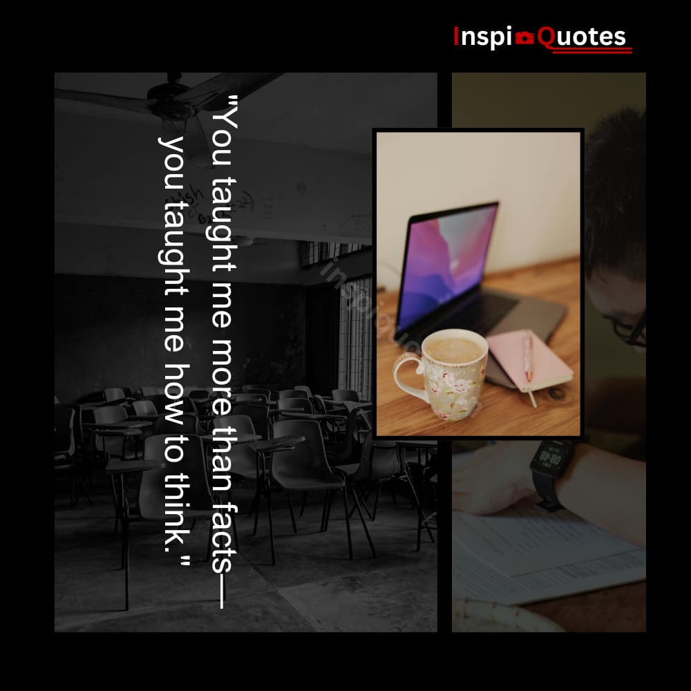 This empty classroom turns facts into philosophy. The quote celebrates the teacher who taught thinking — not just content. The collage of study tools and quiet space reflect depth, reflection, and emotional clarity.