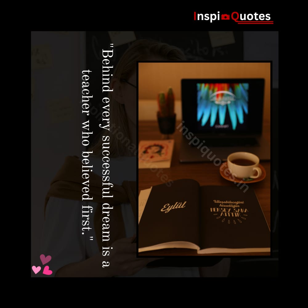 This laptop-and-coffee moment turns belief into breakthrough. The quote honors the teacher who believed before anyone else did. The Turkish notebook and abstract screen reflect global gratitude and emotional resonance.