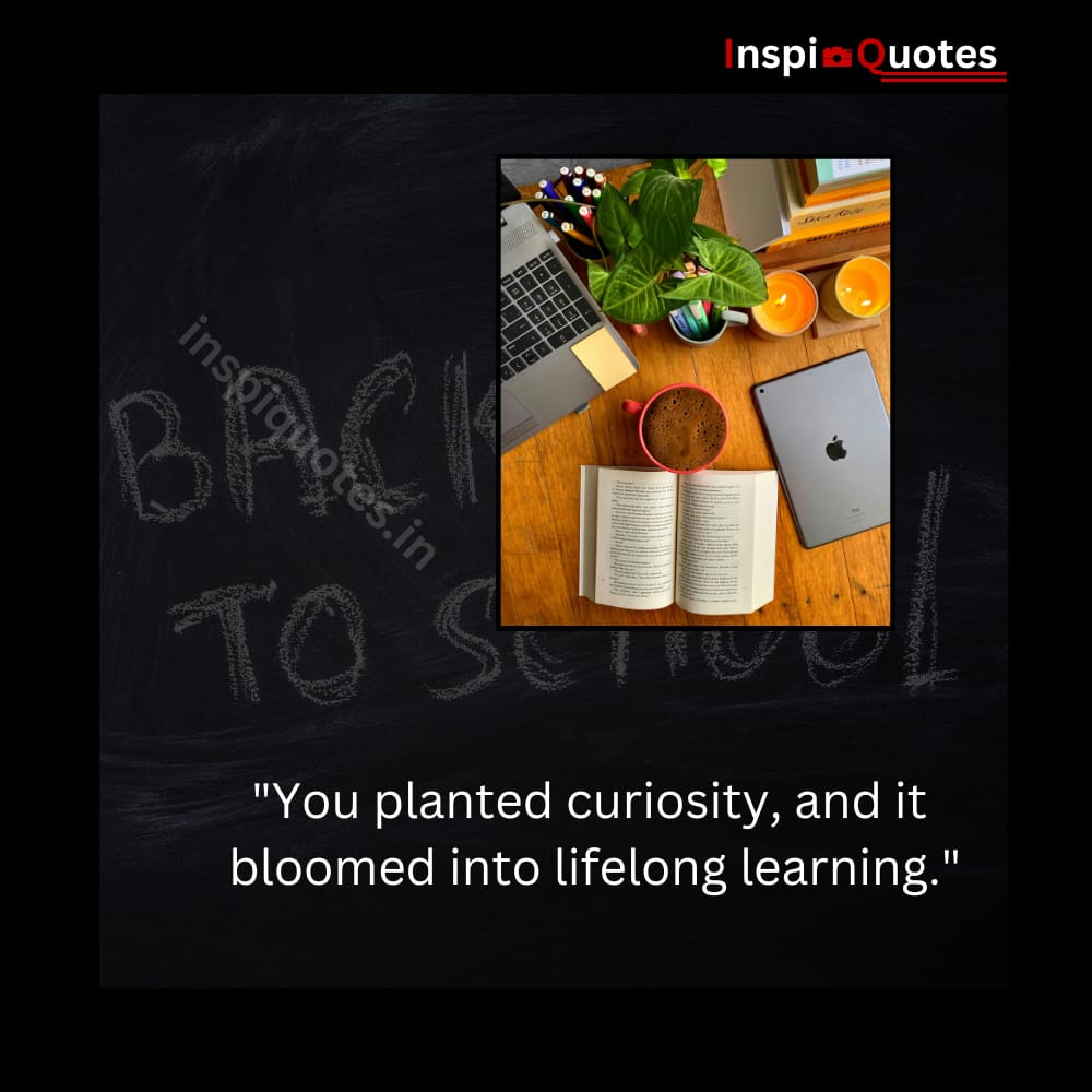 This chalkboard-and-coffee setup turns learning into legacy. The quote celebrates the teacher whose spark of curiosity became a lifelong flame. The workspace and “Back to School” echo reflect emotional continuity and intellectual growth.