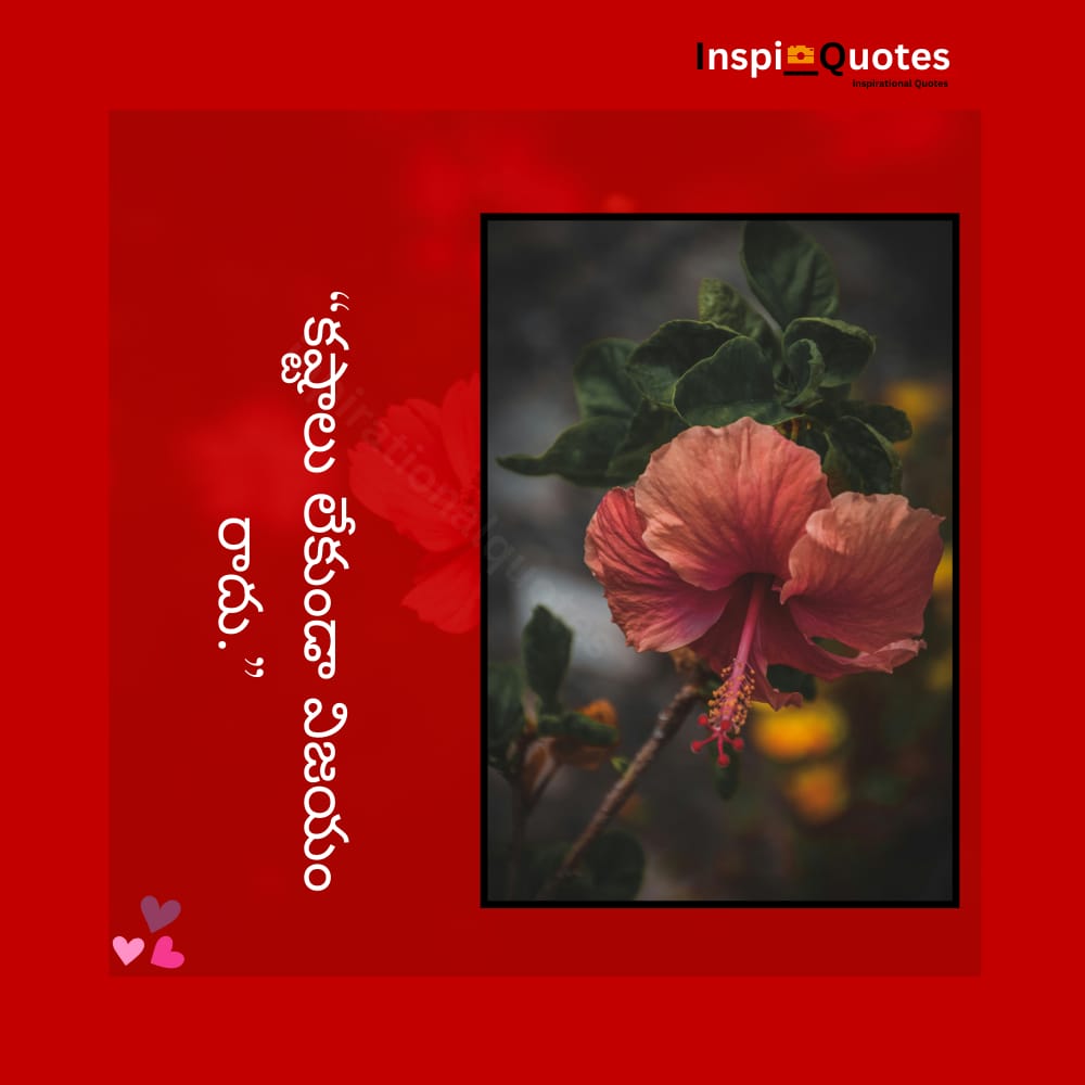 “కష్టాలు లేకుండా విజయం రాదు” — హిబిస్కస్ పుష్పం మధ్యలో ఉండి, ఈ కోట్ను ఒక శ్రమతో నిండిన విజయంగా చూపిస్తుంది. ఇది కష్టాన్ని అంగీకరించి ముందుకు సాగమని ప్రేరణ ఇస్తుంది.