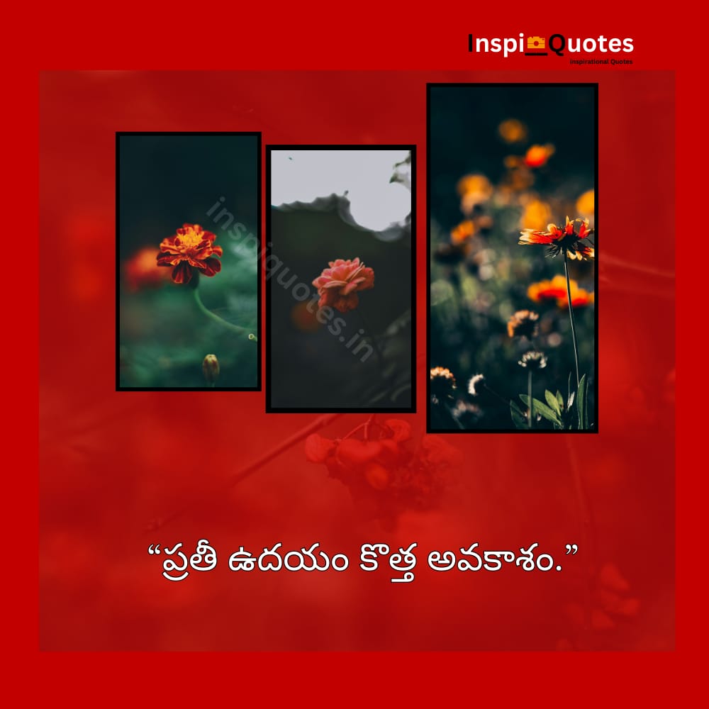 “ప్రతి ఉదయం కొత్త అవకాశం” — మూడు ప్యానెల్స్లో ఉన్న పుష్పాలు ఈ కోట్ను ఒక కొత్త ప్రారంభంగా చూపిస్తాయి. ఇది ప్రతి రోజు ఒక అవకాశంగా చూడమని ప్రేరణ ఇస్తుంది.