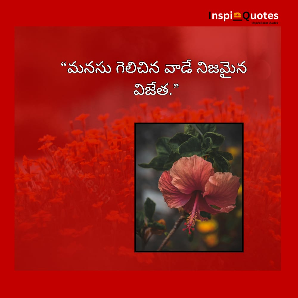 “మనసు గెలిచిన వాడే నిజమైన విజేత” — హిబిస్కస్ ఫ్లవర్ foregroundలో ఉండి, ఈ కోట్ను ఒక అంతర్గత విజయం గా చూపిస్తుంది. ఇది మనసును గెలవడం ద్వారా నిజమైన విజయాన్ని పొందవచ్చని చెబుతుంది.