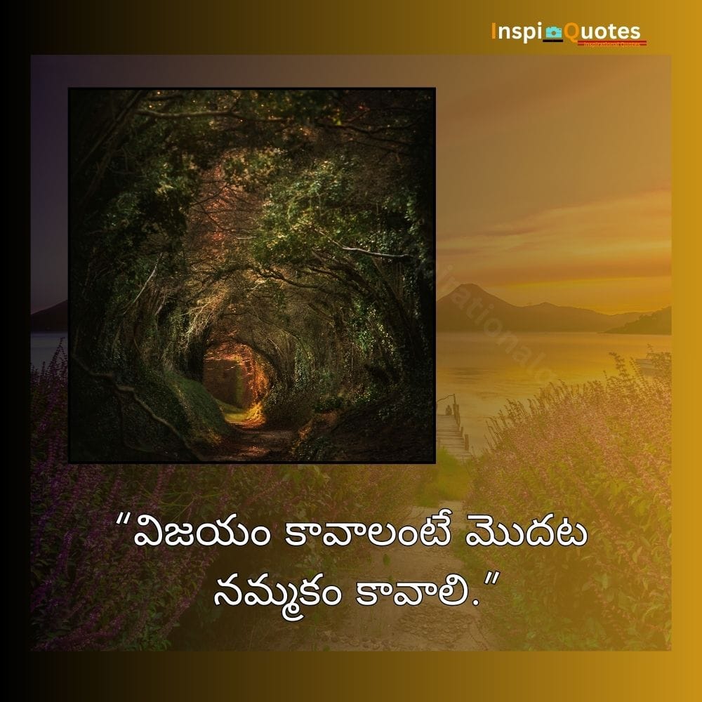 “విజయం కావాలంటే మొదట నమ్మకం కావాలి” — చెట్లతో ఏర్పడిన టన్నెల్ లాంటి మార్గం, ఈ కోట్ను ఒక విశ్వాసంతో నిండిన ప్రయాణంగా చూపిస్తుంది. ఇది విజయం ముందు నమ్మకం అవసరమని గుర్తు చేస్తుంది.