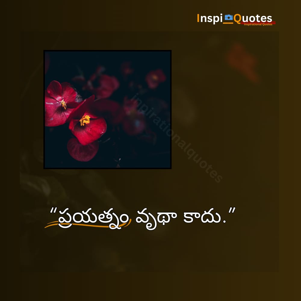 “ప్రయత్నం వృథా కాదు” — vibrant red పుష్పాలు ఈ కోట్ను ఒక hopeful reminder గా చూపిస్తాయి. ఇది ప్రతి ప్రయత్నం విలువైనదే అని గుర్తు చేస్తుంది.