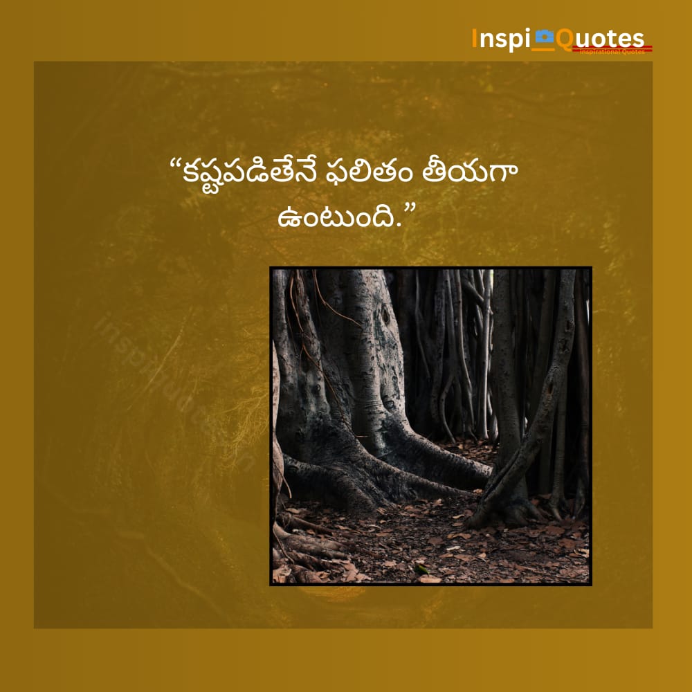 “కష్టపడితేనే ఫలితం తీయగా ఉంటుంది” — చెట్టు వేర్లు ఈ కోట్ను ఒక deep-rooted effort గా చూపిస్తాయి. ఇది శ్రమ ద్వారా వచ్చే మధుర ఫలితాన్ని ప్రతిబింబిస్తుంది.