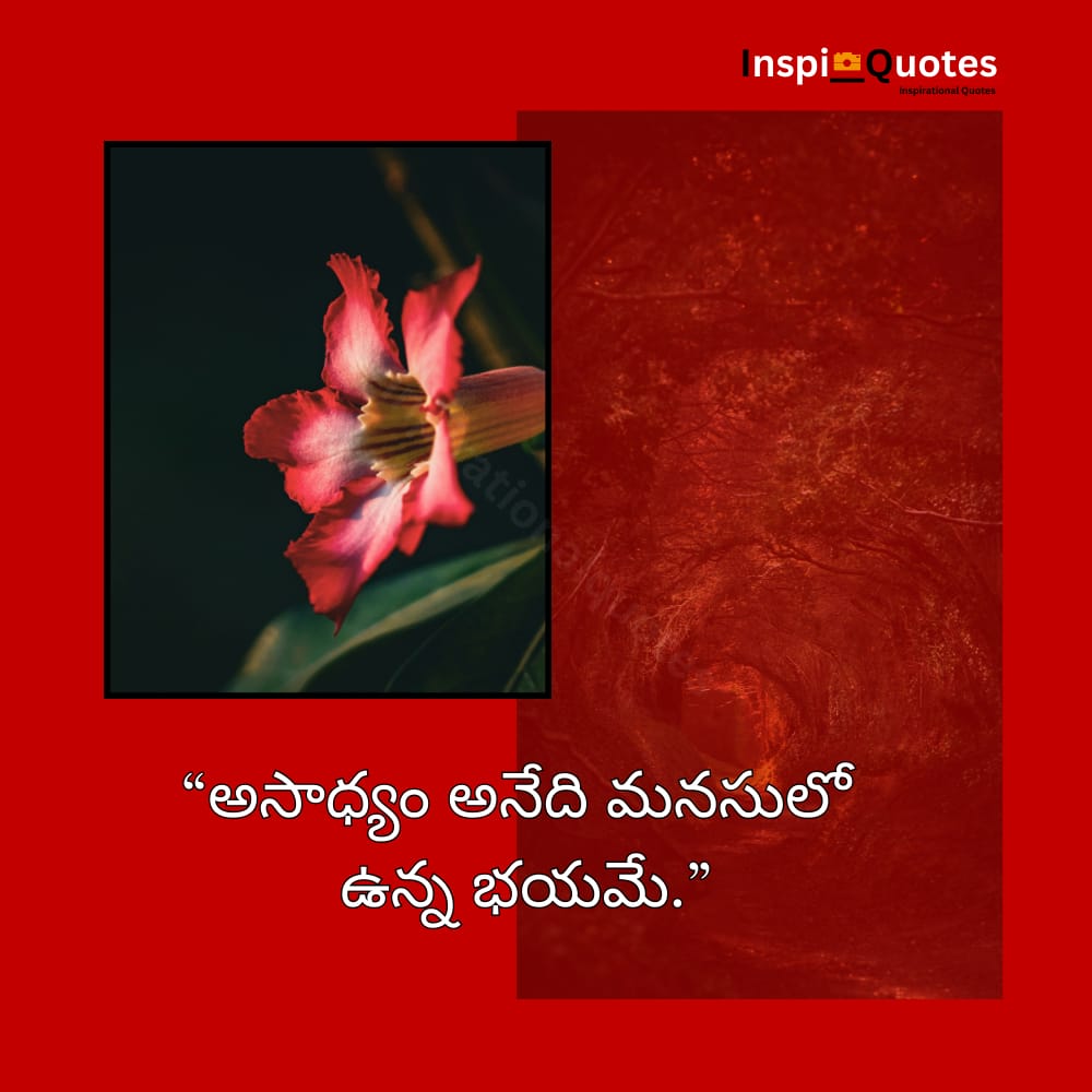 “అసాధ్యం అనేది మనసులో ఉన్న భయమే” — పుష్పం మరియు abstract texture కలయిక ఈ కోట్ను ఒక mental clarity గా చూపిస్తుంది. ఇది భయాన్ని అధిగమించి సాధ్యం చేయమని సూచిస్తుంది.