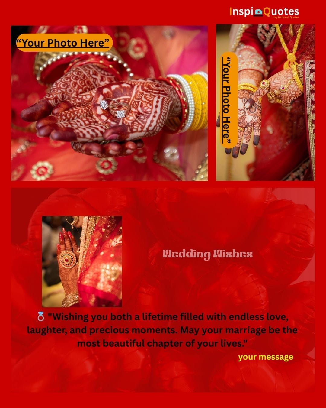Design Insight: Rich Tradition & Affection: Dominated by a strong red color and intricate close-ups of Mehendi hands and wedding jewelry. The composition emphasizes intense color saturation and the delicate, symbolic ritual of the ring and adornments.