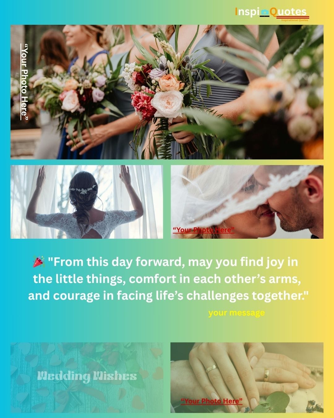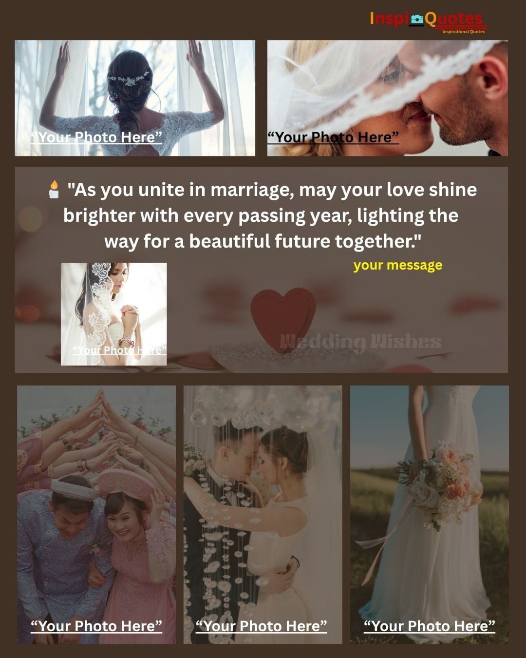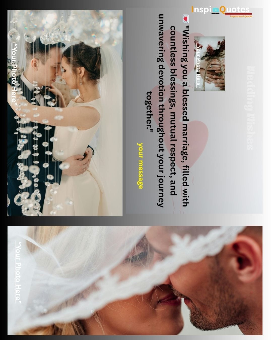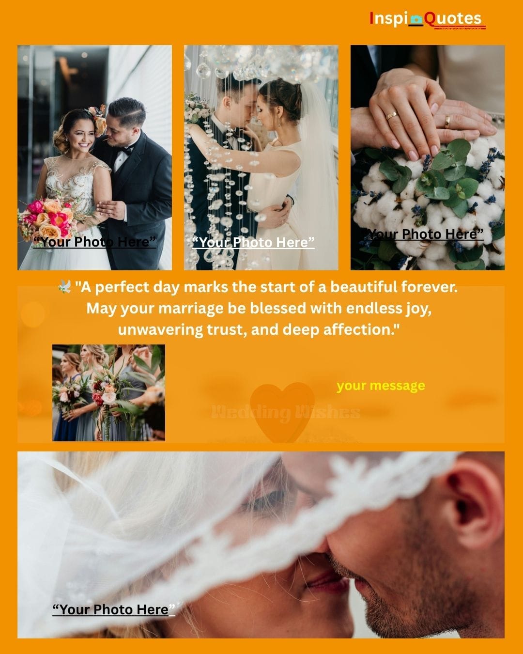 Design Insight: Aspirational & Light: A multi-photo grid showcasing the progression of the relationship (veiled kiss, ceremony, bouquets). The warm, supportive color overlay unifies the diverse scenes, positioning the couple's love as a perpetual light that guides their future.