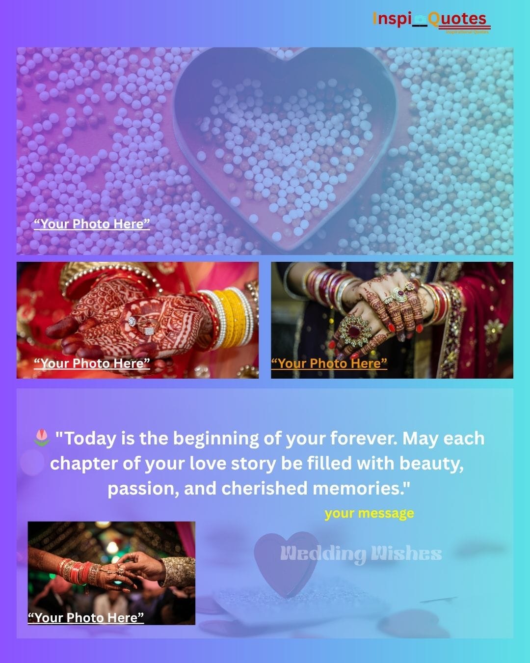 Design Insight: Cultural Beginning & Romance: A design rich in cultural symbols (Mehendi, bangles) blended with modern romance (heart-shaped bowl). The purple-to-teal gradient provides a soft, celebratory backdrop, framing the core theme of starting a forever journey with beauty and passion.