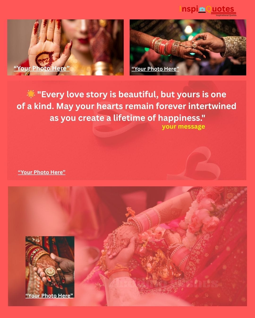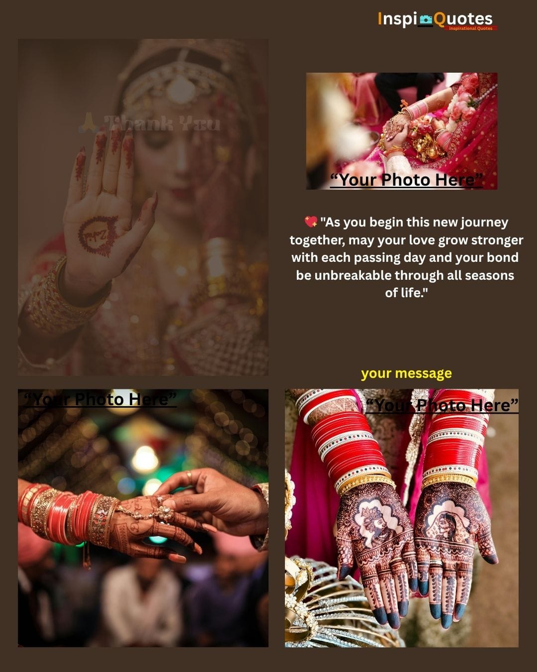 Design Insight: Ceremonial & Unbreakable Bond: Focuses on the physical ritual of the wedding (hand holding, chura/bangles). The collage uses images of the ring exchange and Mehendi-adorned palms, creating a visual promise of strength and commitment through all seasons.