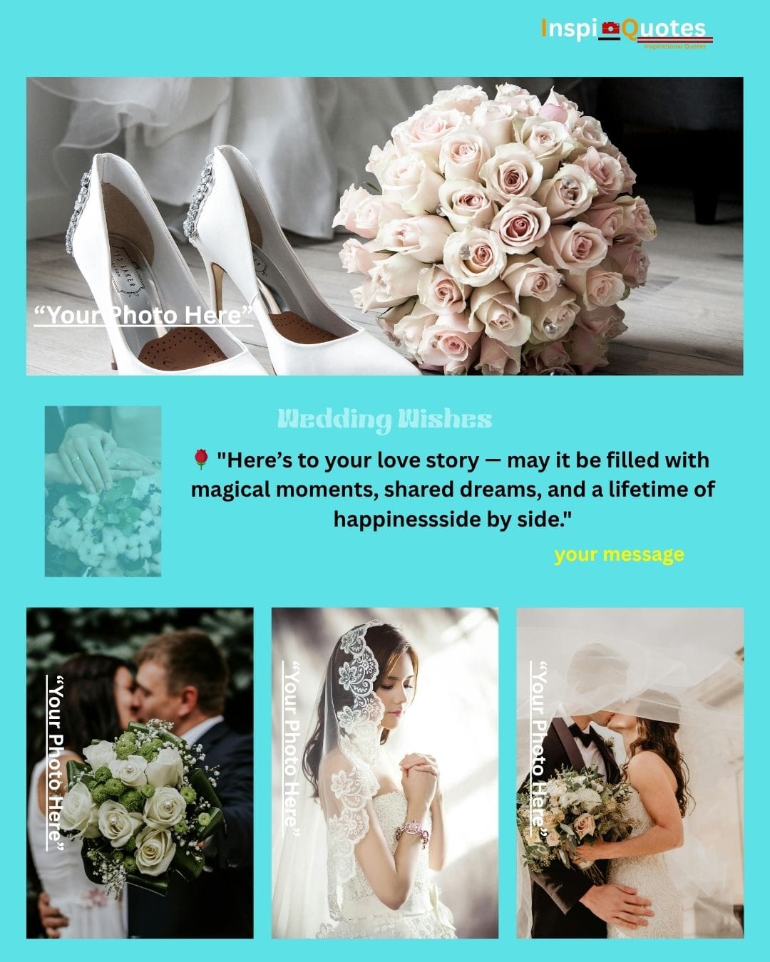 Design Insight: Bridal Details & Romance: Centers on key bridal aesthetic elements (shoes, bouquets, veil). The aqua/teal color block provides a cool, serene backdrop for images of the couple (kissing under veil, hugging), highlighting the magical details of the love story.