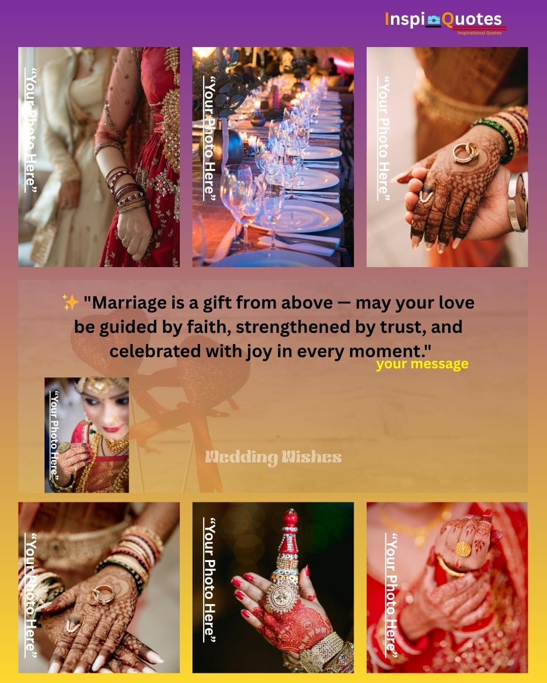 Celebrate the **joy of marriage** with our beautiful **Wedding Greeting Cards**. At InspiQuotes, we go beyond simple templates to create digital designs that truly tell a love story. You can personalize your card with a **treasured photo** and **heartfelt message**, crafting a unique digital keepsake for the couple.
